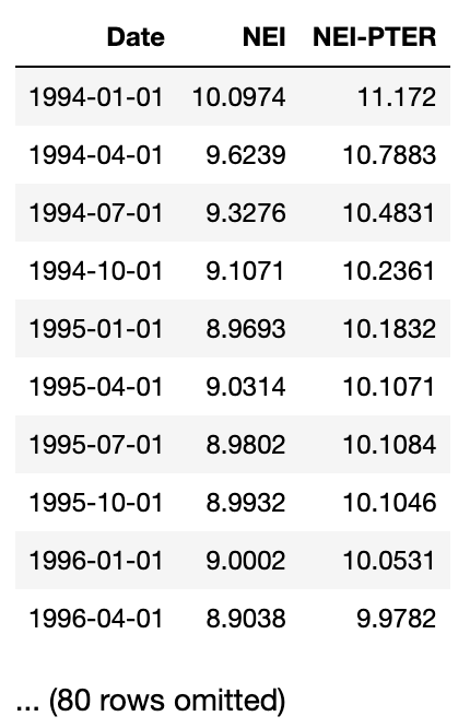 by_nei_pter.show(5)Question 5.3. Using take, assign greatest_nei to a table containing the data for the 11 quarters when NEI was greatest.