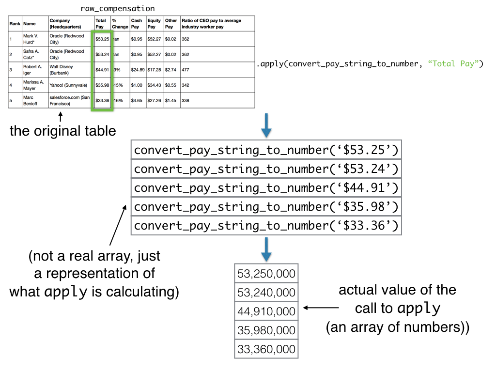 apply calls a function many times, once on each element in a column of a table. It produces an array of the results. Here we use apply to convert every CEO’s pay to a number, using the function you defined: